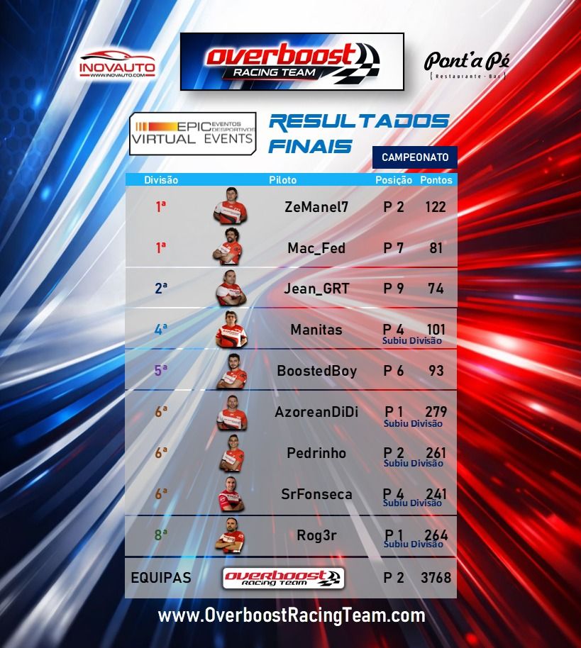 Chegou ao fim mais uma temporada da Epic Virtual Events, foram 7 provas muito disputadas, onde muitos dos nossos pilotos pilotos conseguiram os objectivos propostos, e assim favorecendo a equipa ajudando a alcançar o 2º lugar na competição por equipas.